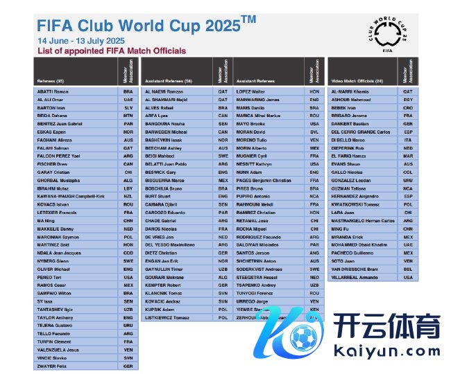 2025年海外足联俱乐部宇宙杯将于北京期间2025年6月15日至7月14日在好意思国举行,这是世俱杯改制后的首届赛事,亦然裁判初度辅导规则纪录仪的比赛。值得一提的是,本届世俱杯裁判名单中,有两名中国籍裁判入选。