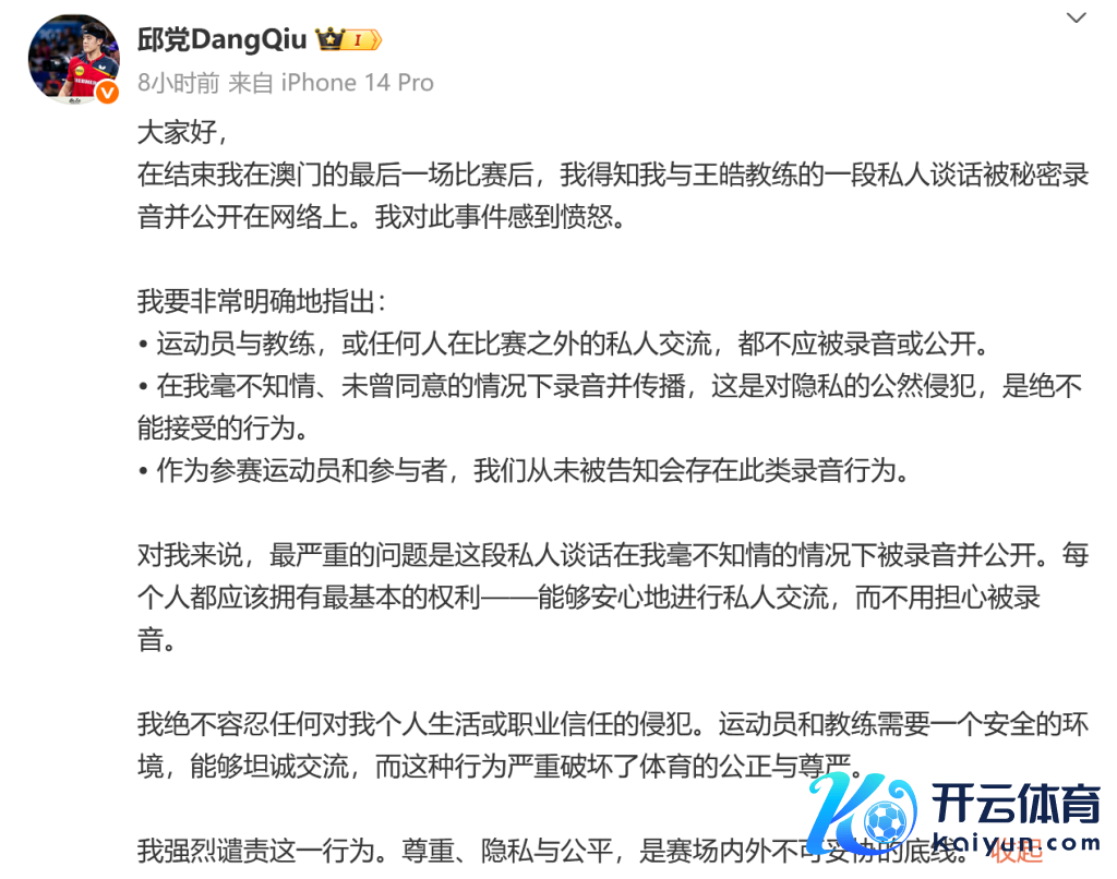 在截止我在澳门的临了一场比赛后,我得知我与王皓评释的一段私东谈主言语被深重灌音并公开在收罗上。我对此事件感到盛怒。