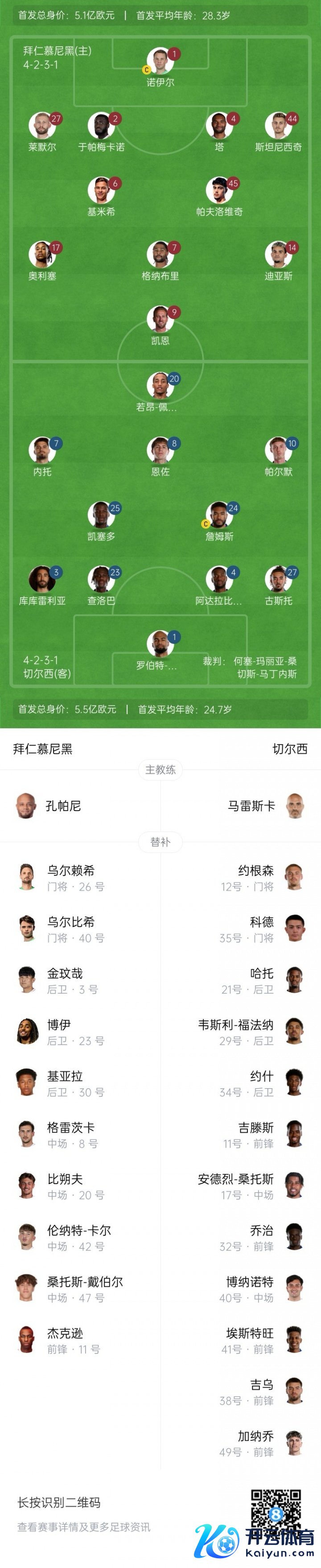 拜仁首发:1-诺伊尔、2-于帕梅卡诺、4-塔、27-莱默尔、44-斯坦尼西奇、6-基米希、45-帕夫洛维奇、7-格纳布里、14-迪亚斯、17-奥利塞、9-凯恩