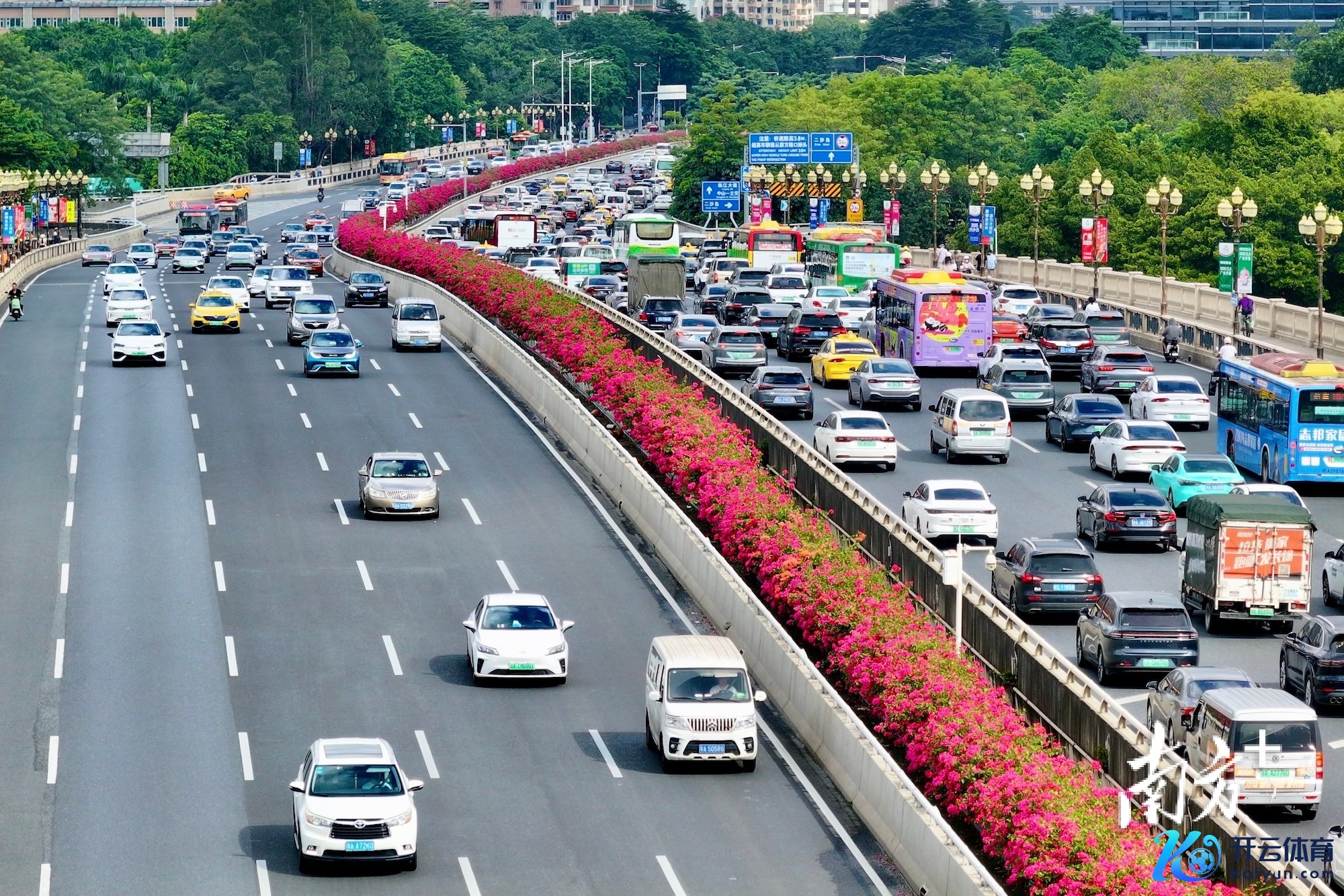 广州大桥中央灵通的簕杜鹃随从着车流全部向北逶迤。