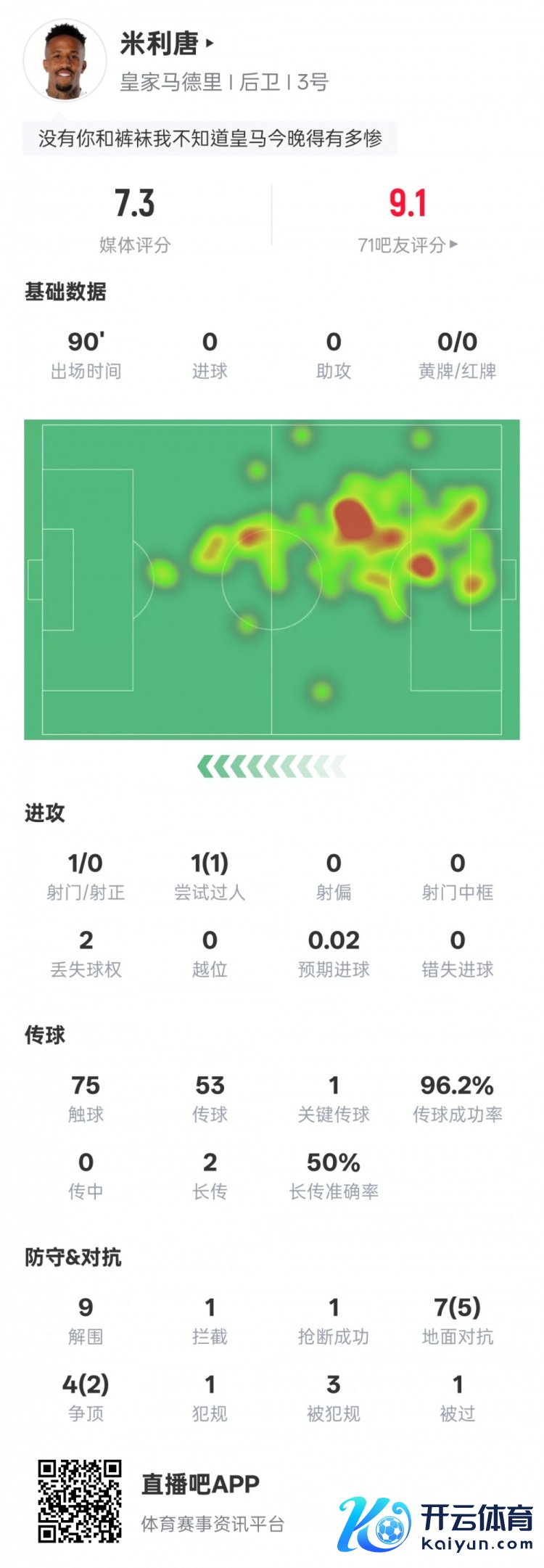 11月5日讯 欧冠联赛阶段第4轮,皇马客场0-1不敌利物浦。米利唐本场首发出战,送出1次重要传球,9次突围,传球得胜率96.2%,评分7.3。