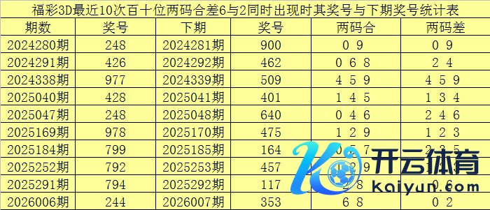 从以上统计不错看出,百十位两码合差6与2同期出现之后其下期两码合差融会最热的4个分歧为:0249,本期百十位两码合差不错参考这四码中的数据。