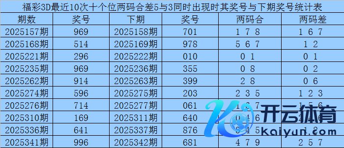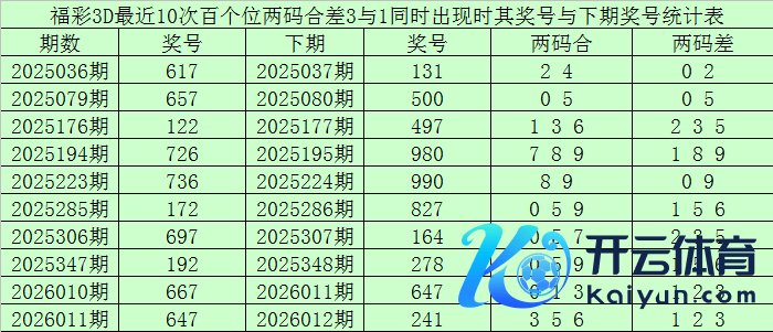 从以上统计不错看出,百个位两码合差3与1同期出现之后其下期两码合差融会最热的4个分歧为:0159,本期百个位两码合差不错参考这四码中的数据。
