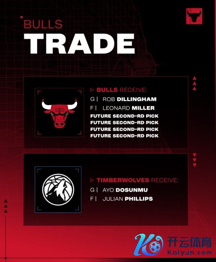 交游确定为:公牛送出说念苏姆和菲利普斯,从丛林狼换来迪林厄姆、伦纳德·米勒、4个次轮签。