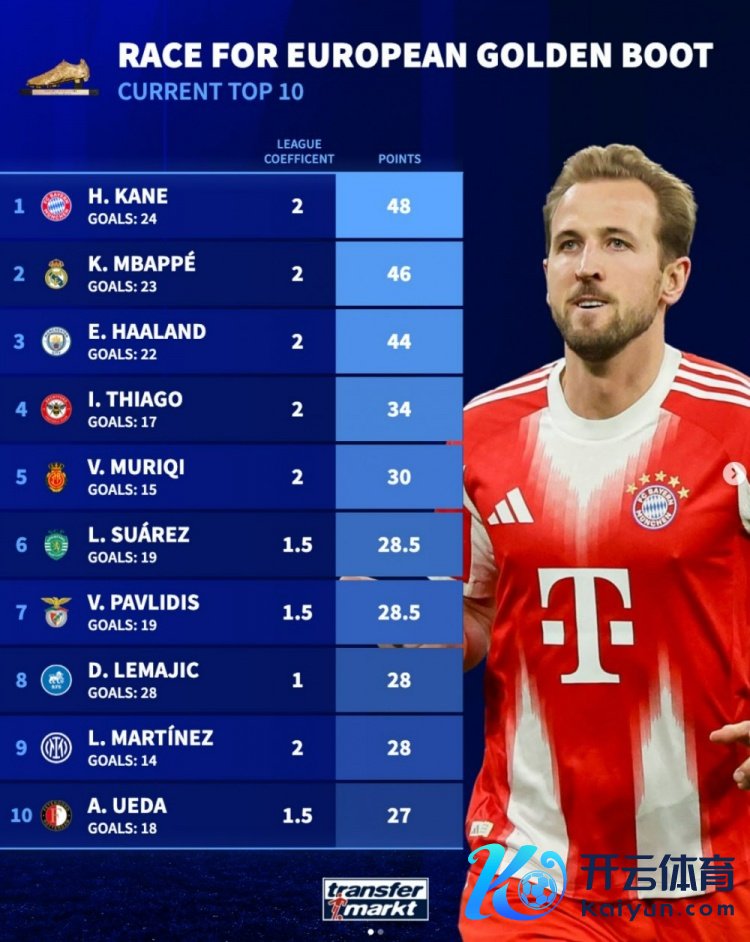 你的位置:买球站-欧洲杯足球压球网-五大联赛买球赛-欧预赛买球网-中欧买球网-亚洲体育FIFA滚球_欧洲杯体育新闻 > 欧洲杯体育信息 > 具体如下:1、凯恩(拜仁) 24球 48分2、姆巴佩(皇马) 23球 46分3、哈兰德(曼城) 22球 44分4、伊戈尔·蒂亚戈(布伦特福德) 17球 34分5、穆里奇(马略卡) 15球 30分6、L·苏亚雷斯(葡萄牙体育) 19球 28.5分7、帕夫利季斯(本菲卡) 19球 28.5分8、莱马伊奇(里加) 28球 28分9、劳塔罗(国米) 14球 28分10、上田绮世(费耶诺德) 18球 27分