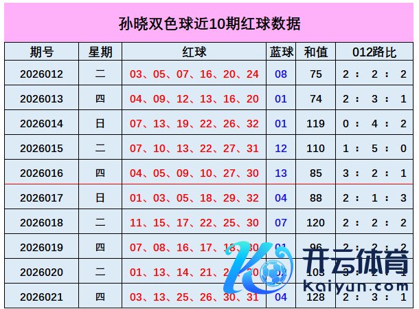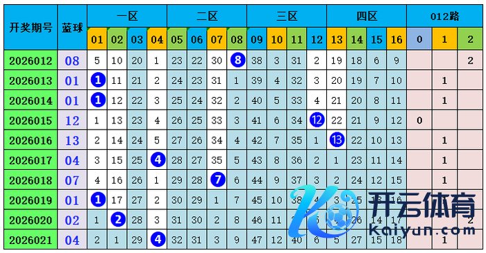 上期总结:双色球第2026021期开出奖号:红球03、13、25、26、30、31;蓝球04,其中红球和值为128,012路比为2:3:1,奇偶比4:2,蓝球开出小偶数号码04。