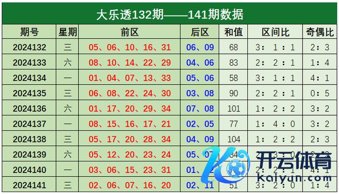 大乐透第2024141期出奖号统计:前区02、06、07、16、20欧洲杯体育信息,后区02、11。和值为51,区间比为3:2:0,奇偶比为1:4。