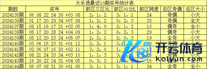 大乐透第2024144期奖号开出:06 07 08 21 30 +01 05。其中前区三区比为3:1:1,012路比为3:1:1,后区开出全小、全奇奖号。