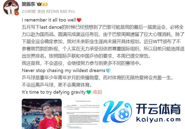 在详实施展我方决定的声明中,樊振东坦诚地显现了内心的宗旨和将来的盘算。他提到,在完成巴黎奥运会的可贵任务后,我方关于将来的行状说念路尚未有具体且明确的盘算。同期,WTT近期颁布的一项新划定——不参赛即靠近罚金,也让他感受到了前所未有的压力。在尊重海外组织划定与自我发展之间,樊振东经过三想尔后行,最终选拔了退出寰球名次这一颇具争议的说念路。然则,值得注目的是,他明确示意这一决定并不等同于退役,我方仍然怀揣着对乒乓球的喜欢,指标在将来的日子里连续建立全运会等国内进击赛事。