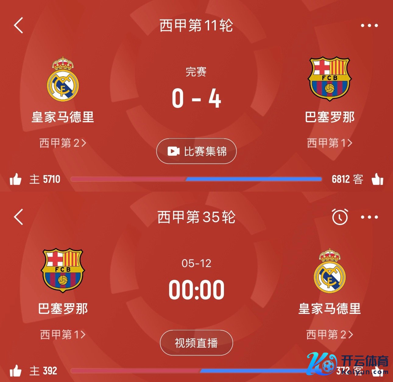 西甲:首回合皇马0-4巴萨,次回合巴萨vs皇马(第35轮,暂定5月12日)
