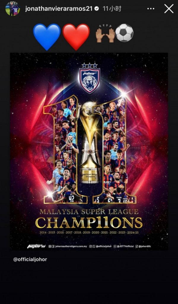 2月25日讯 随柔佛新山提前4轮夺得24/25赛季马来西亚超等联赛冠军后,现年35岁的国安旧将比埃拉在社媒晒出海报进行了庆祝。 24日进行的马来西亚超等联赛第22轮比赛,柔佛新山主场2-0打败轰隆,提前4轮问鼎本赛季冠军。赛后,比埃拉晒出了夺冠的海报,并附上了多个模样庆祝柔佛新山提前夺冠。 旧年9月底离开阿联酋豪尔费坎后欧洲杯体育信息,开脱身的比埃拉于2月初与柔佛新山完成了签约并身披10号球衣。......