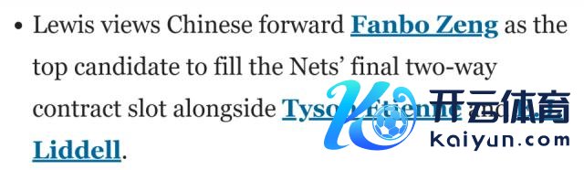 北京期间 9 月 10 日,篮网有名队记 Brian Lewis 撰文解读球队近况,他在著作中谈到了曾凡博的情况体育集锦,并暗示这位中国前卫是篮网临了一个双向公约限额的头号东说念主选。