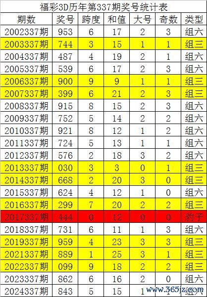 从以上统计不错看出,积年3D第338期开出了4次组三号码,开出了17次组六号码。组六号码出现概率大,本期预测开出组六号码。