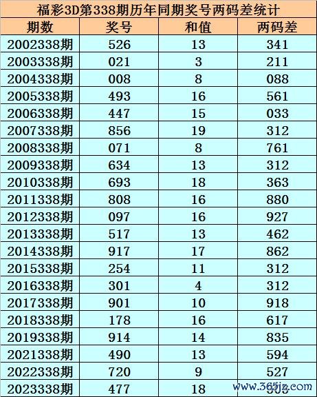 福彩3D第338期,历史上期开出21次奖号,其奖号辩别为:526、021、008、493、447、856、071、634、693、808、097、517、917、254、301、901、178、914、490、720、477,奖号两码合差辩别开出: