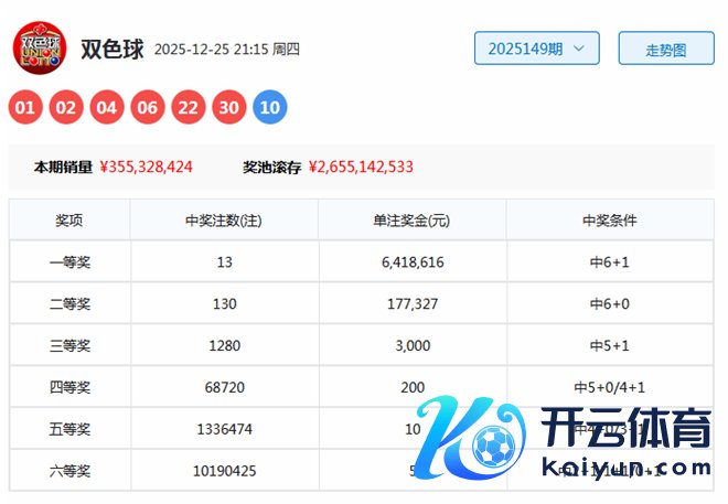 双色球第2025149期奖号为:01、02、04、06、22、30+10。