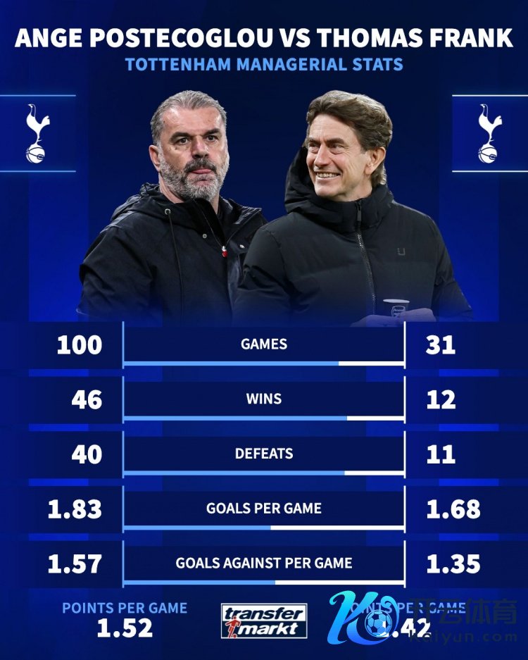 1月8日讯 德国转会阛阓统计了波斯特科格鲁、弗兰克抓教热刺的数据,并作念出对比。