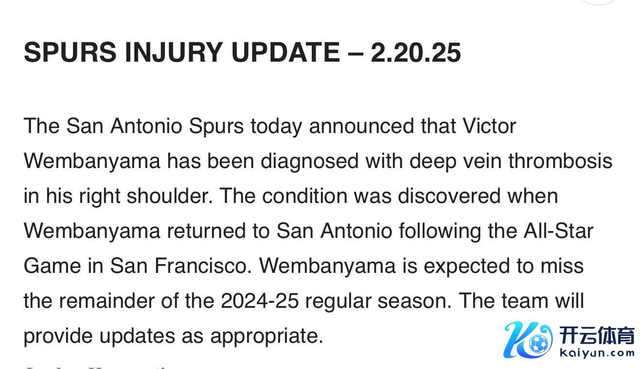 圣安东尼奥马刺队本日文书,维克托-文班亚马被会诊出右肩深静脉血栓。这一情况是在文班亚马插足完旧金山全明星赛后复返圣安东尼奥时发现的。文班亚马预测将缺席2024-25赛季老例赛剩余比赛。球队将应时提供进一步更新。