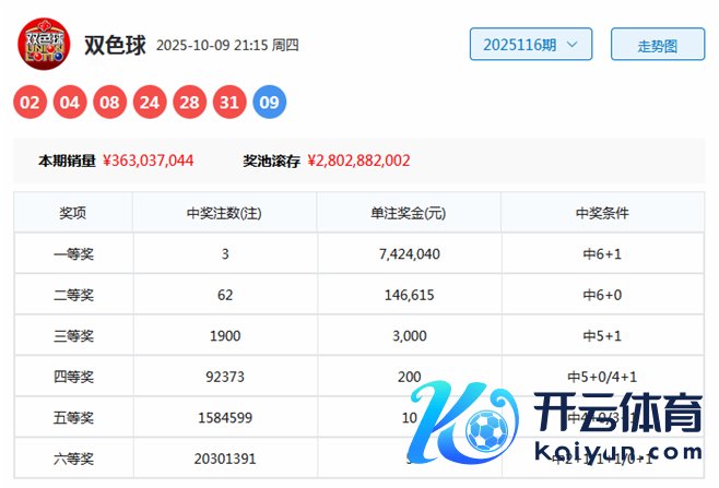双色球第2025116期开奖,红球:02、04、08、24、28、31;蓝球:09。其中红球012路比为1:3:2,奇偶比为1:5,和值为97,跨度为29体育录像/图片,蓝球开出0路号码。