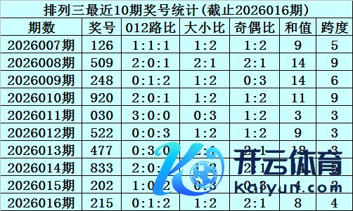 上期总结:胪列三2026016期奖号为215,奇偶比为2:1,大小比为1:2,跨度为8。