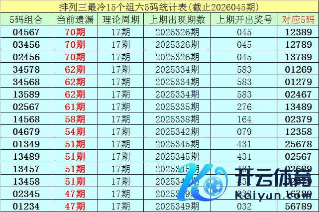 (5)罗列三现在遗漏值最大的5码组六组合为:04567、03456、02456,本期遗漏70期,本期这3个五码解冻的可能性较小,则对应五码中可能齐会开出奖号。