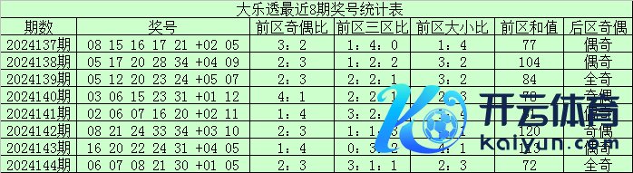 大乐透第2024144期奖号为:前区:06、07、08、21、30,后区:01、05。其中前区奇偶比为2:3,大小比为2:3,三区比为3:1:1,和值为72。