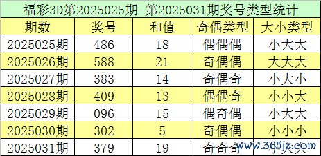福彩3D第2025031期回来:奖号为379,奖号奇偶比为3:0,大小比为2:1,和值为19,类型为组六。