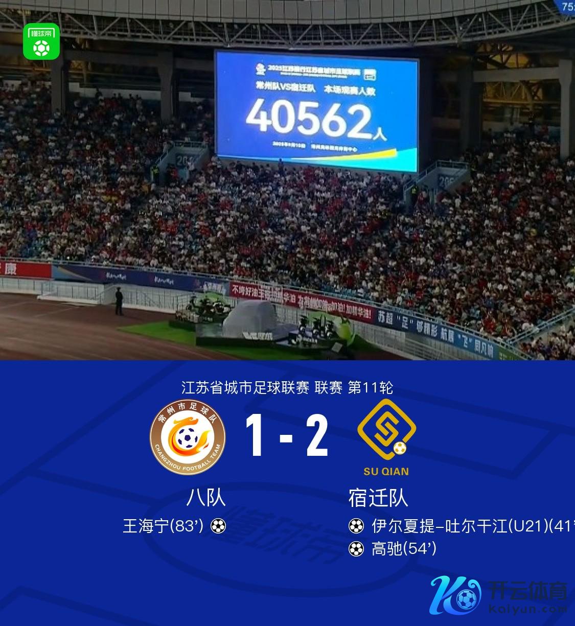 第42分钟,破损僵局,伊尔夏提抢点头球破门,宿迁队1-0常州队