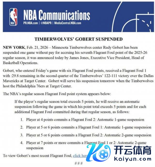北京技艺 2 月 22 日,NBA 篮球运营本质副总裁詹姆斯 - 琼斯当天晓示,明尼苏达丛林狼队中锋鲁迪 - 戈贝尔因在 2025-26 惯例赛累计第 7 个坏心犯规积分,被处以禁赛一场且无薪的照应。这位 33 岁内线将再耗费 201,149 好意思元薪水,而丛林狼则能得回 100,575 好意思元的奢华税减免额度。