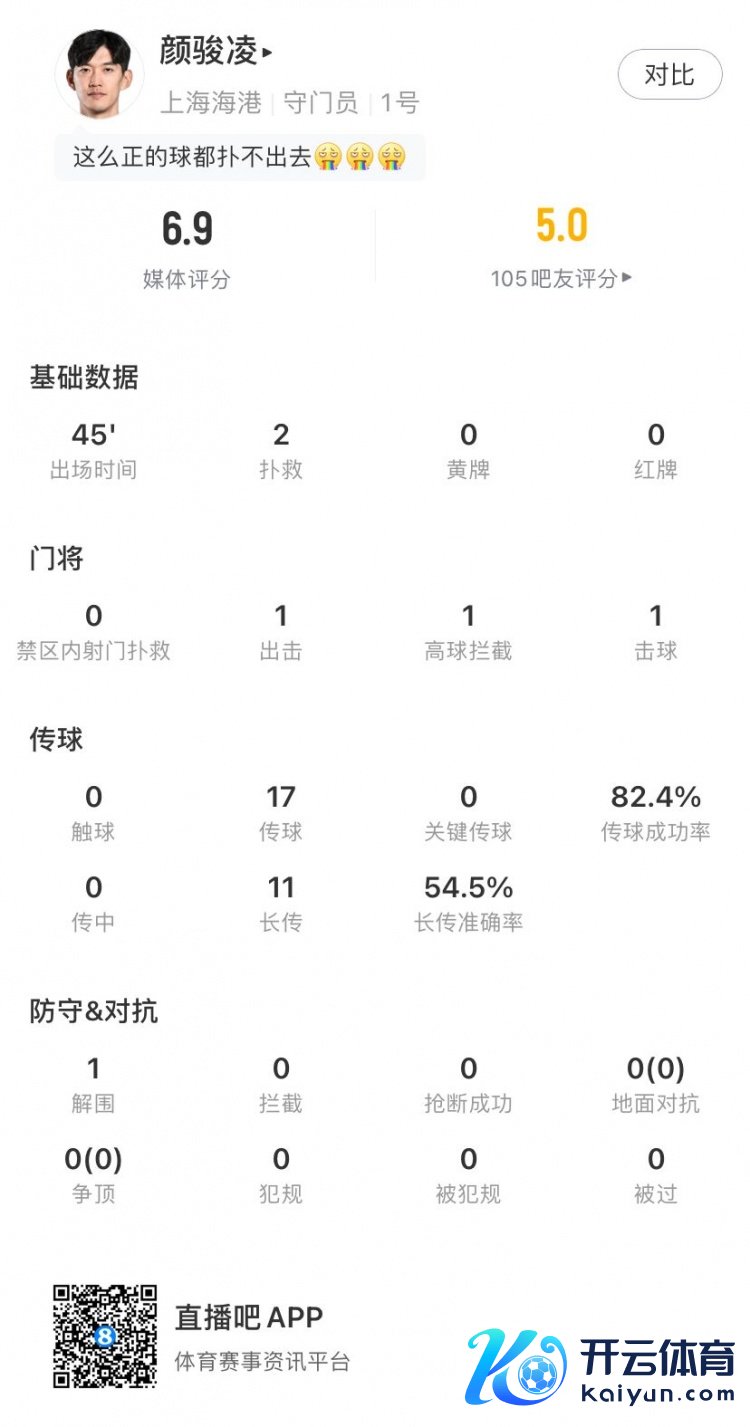 2026-03-063月1日讯 超等杯决赛,上海海港半场0-1落伍北京国安。上海海港门将颜骏凌半场数据如下 时辰:45 扑救:2 1次出击,17次传球,1次高球防止,1次突围 传球告捷率82.4%,11次长传,长传准确率54.5% 评分:6.9体育赛事直播