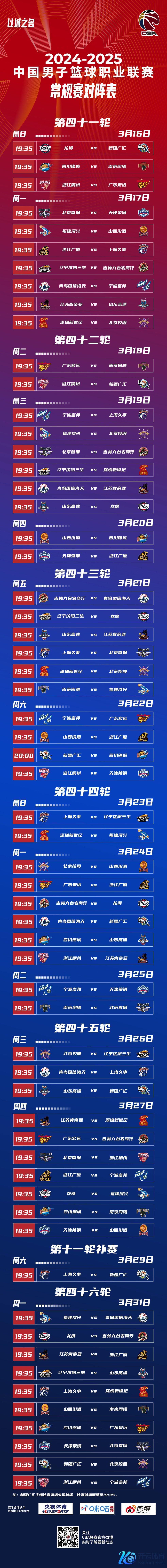2026-03-24央视网音信:北京时辰9月16日体育赛事直播,CBA联赛官方公布《2024-2025赛季CBA联赛惯例赛对阵表》,新赛季CBA联赛将于2024年10月12日开赛,惯例赛共46轮。 官方暗示,由于现在新赛季球队全简称仍在审核经由中,对阵表中球队称号暂用俱乐部简称代替。待新赛季球队简称及比赛场馆信息一起详情后,将另行公布完好意思的《2024-2025赛季CBA联赛惯例赛竞赛日程表》(注:20家俱乐部均须通过2024-2025赛季CBA联赛准入审核后方可参赛)。 具体赛程如下: 体育赛事直播