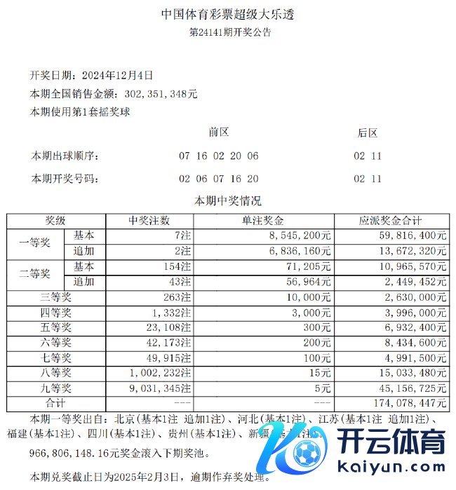 北京技能12月4日晚,体彩大乐透第24141期开奖体育赛事直播,当期开奖号码为:前区02 06 07 16 20,后区02 11。
