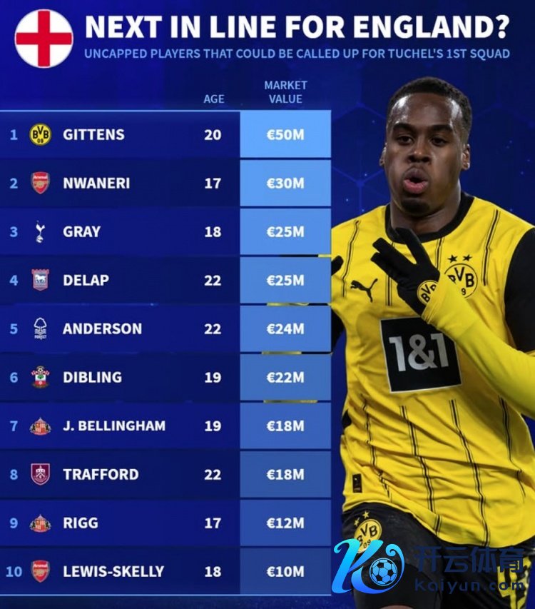 2月27日讯 《转会阛阓》统计了面前仍未被端庄国度队名单征召的英格兰球员最贵身价情况,多特边锋吉滕斯领衔。