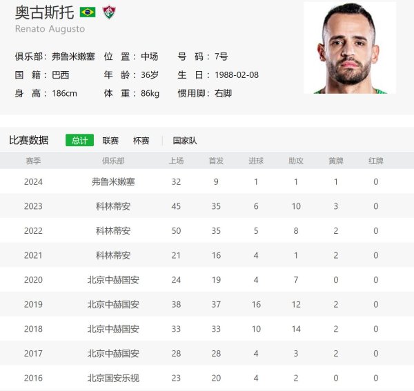 近日体育赛事直播,前北京国安的外助奥古斯托在罗致巴西媒体采访的时刻,说他2025年会在巴西弗鲁米嫩塞退役,在2024年他代表球队出战各项赛事32场,打进1球另有1次助攻。 对此许多球迷也运转泪目,有的球迷说,他跟上海申花效能的莫雷诺相似齐是超等良心的外助。 2016赛季奥古斯托代表北京国安出场,第一个赛季就出场23场,在组织才调与眼下本事齐相比超过。不错说是降维的打击。 在2017赛季的他代表北京国安出场28场比赛, 这个赛季他是比上赛季多出场5场,而且还有4个进球,还有3个......